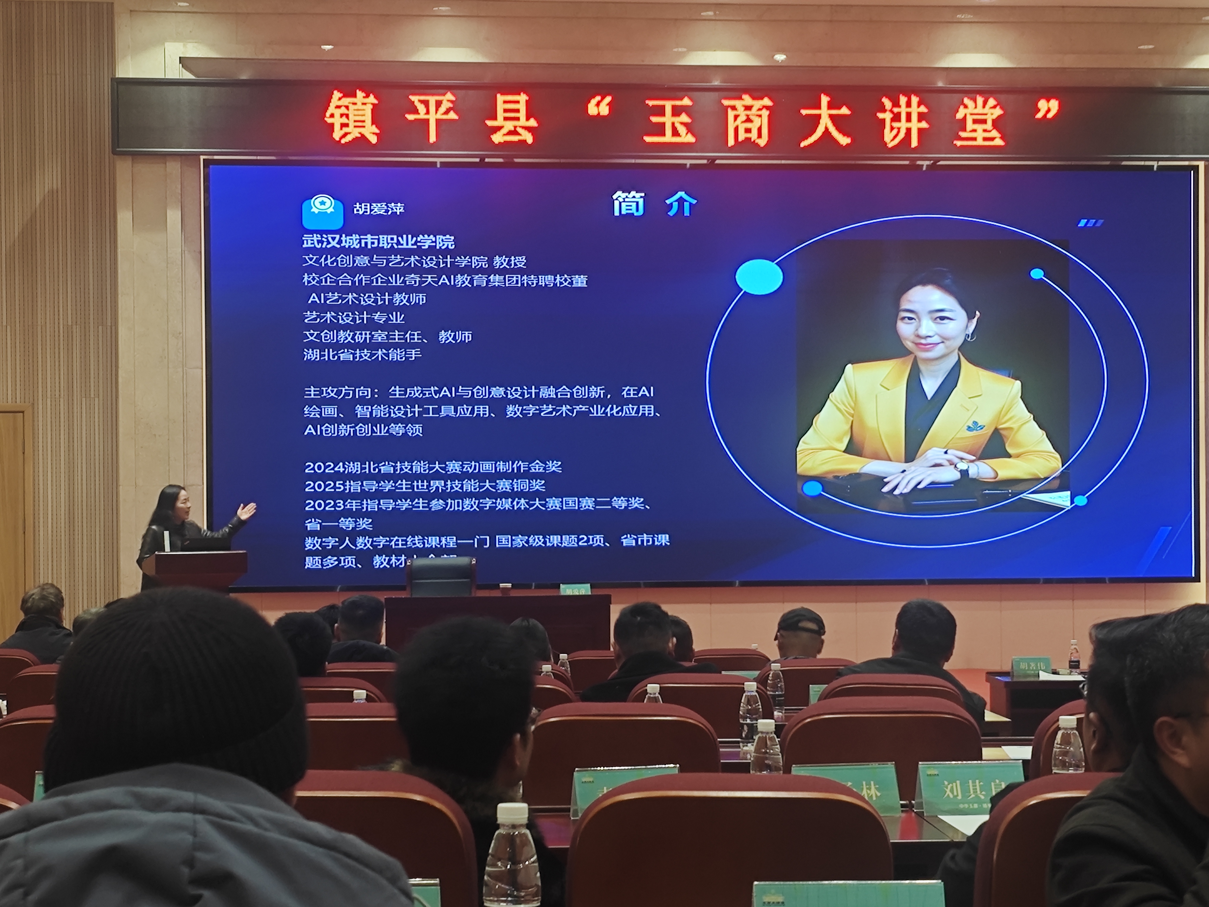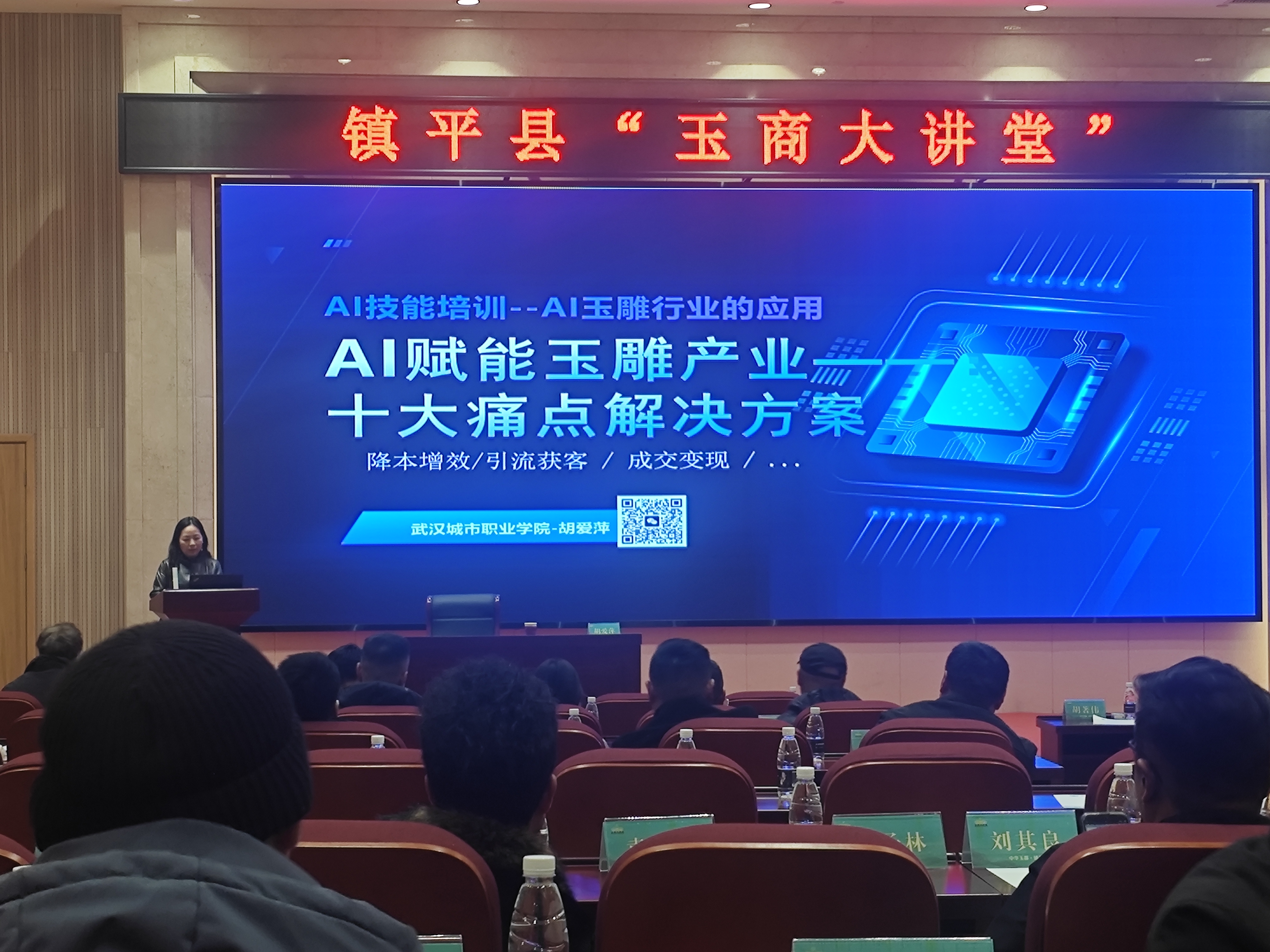武汉城市职业学院文化创意与艺术设计学院胡爱萍教授分享的主题《AI赋能玉雕产业--十大痛点解决方案》,探讨人工智能在玉雕创意与市场运营中的创新应用。