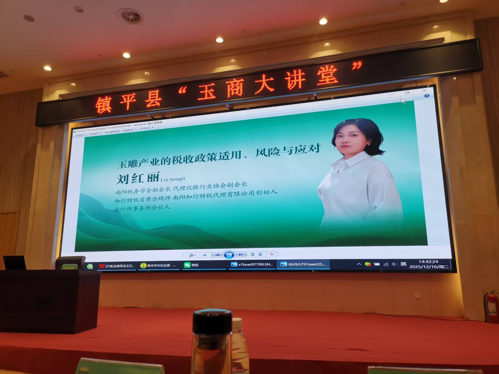 南阳市税务学会副会长单位代表、南阳知行财税代理有限公司创始人刘红丽老师分享主题《玉雕产业的税收政策适用、风险与应对》,从财税合规角度解析行业痛点,助力企业规避风险。